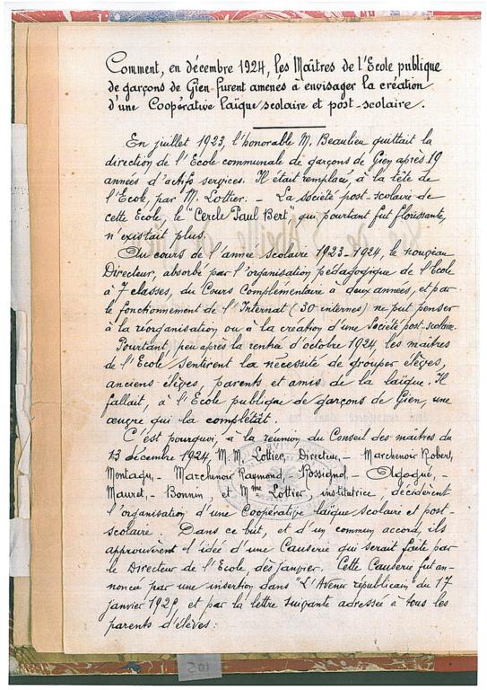 C'est en Octobre 1924 que le Directeur de l'école du Centre et ses Instituteurs ont formulé par écrit le souhait de créer une Amicale Laïque Scolaire et Post-Scolaire