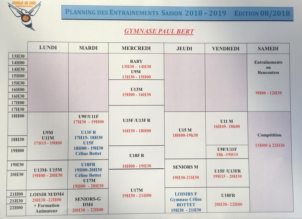 Planning entraînement 2018/2019